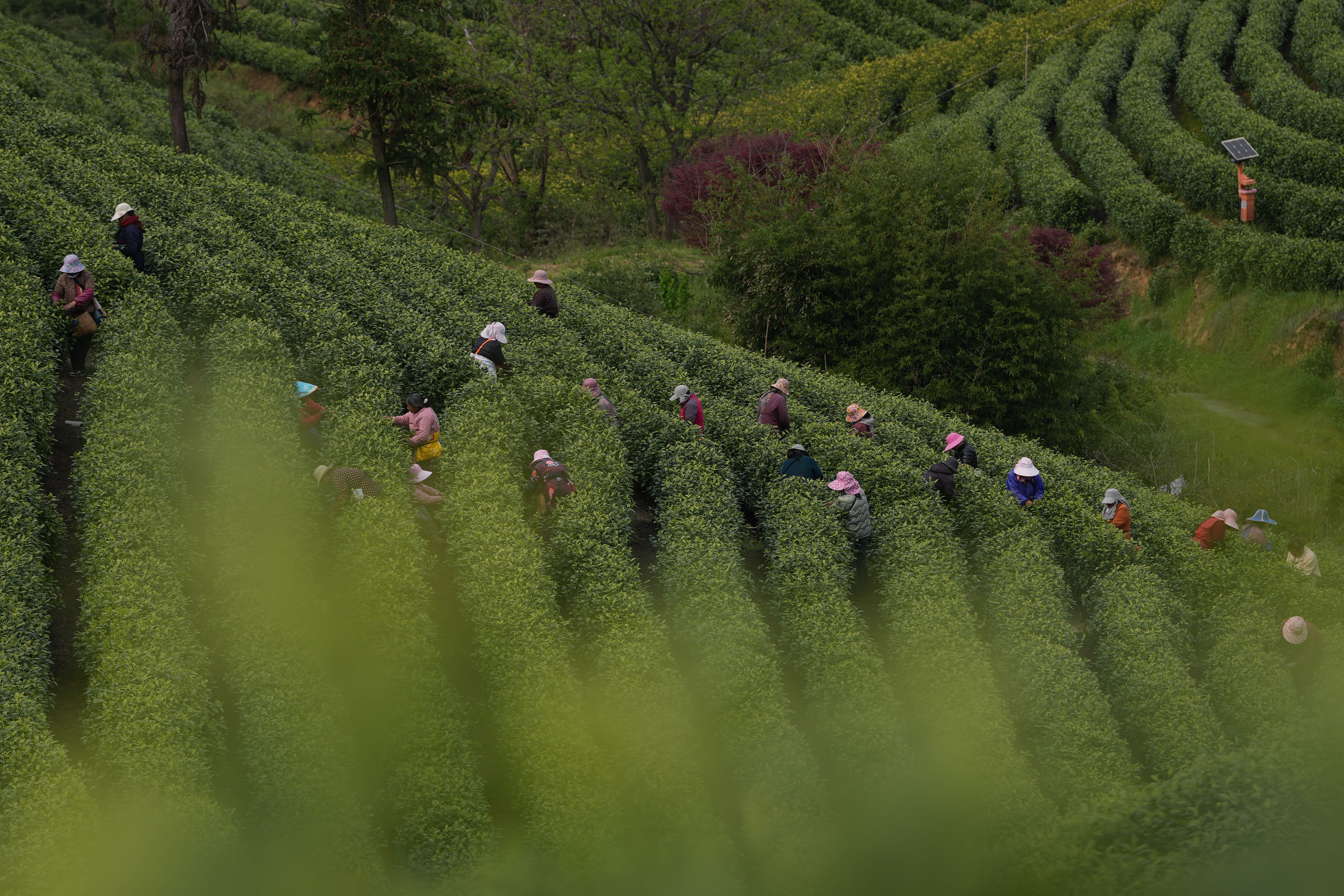 4月8日,采茶工在浙江省安吉县溪龙乡黄杜村的茶山采摘白茶青叶。
