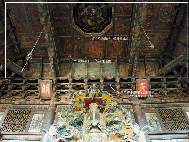 三绝:彩绘。殿宇天花板上绘有彩色壁画五十幅;南厢房侧山墙上另有一幅清康熙年间所绘的《百鸟朝凤图》,色泽至今仍然鲜艳;正殿供奉玉皇大帝,金童玉女侍立两侧。
