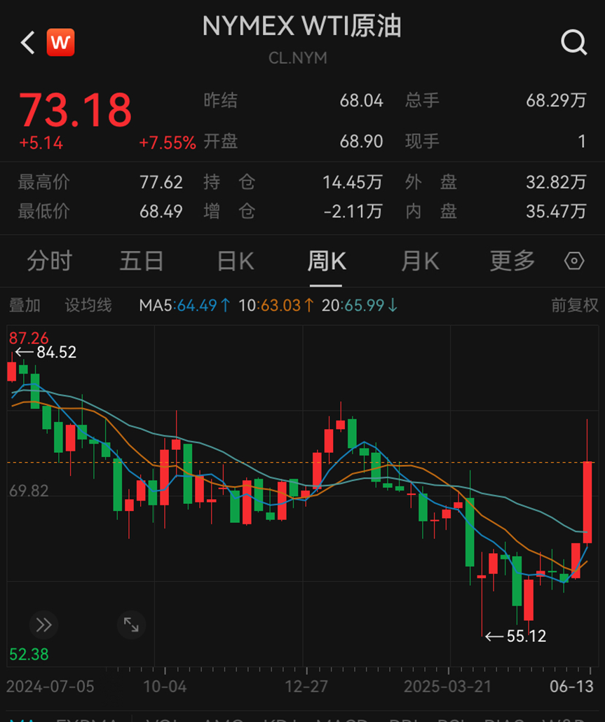 受地缘局势影响,国际原油期货结算价大幅收涨。当地时间周五,WTI 7月原油期货涨幅7.55%,报73.18美元/桶,盘中一度曾涨至77.62美元,逼近2022年6月16日顶部78.48美元。ICE布油收涨8.39%,报75.18美元/桶。