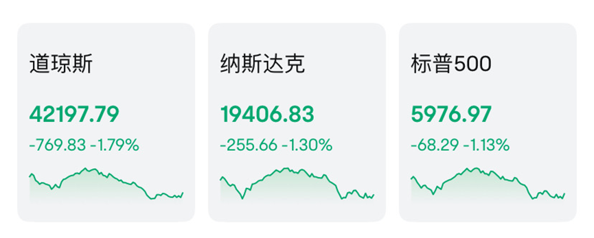 当地时间周五,受中东地区紧张局势升级影响,欧美股市集体收跌,跌幅普遍超过1%。截至收盘,道指跌1.79%报42197.79点,标普500指数跌1.13%报5976.97点,纳指跌1.3%报19406.83点。