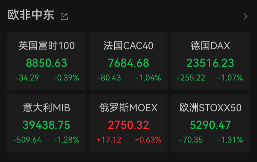欧洲市场方面,欧洲三大股指全线下跌。德国DAX指数跌1.07%报23516.23点,法国CAC40指数跌1.04%报7684.68点,英国富时100指数跌0.39%报8850.63点。本周,德国DAX指数跌3.24%,法国CAC40指数跌1.54%,英国富时100指数涨0.14%。